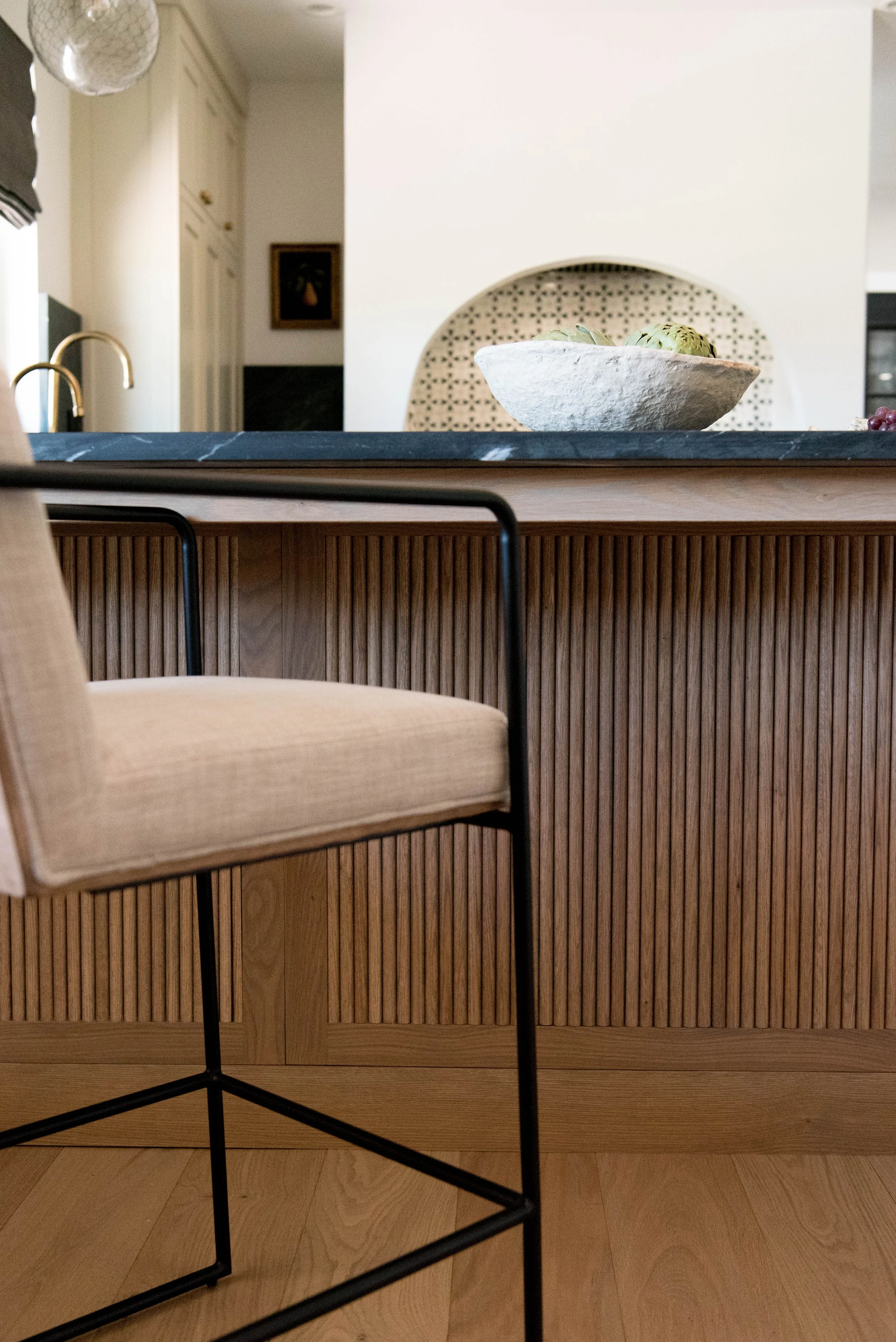 I have always loved the look wood fluting gives to a space and knew I had to incorporate it. I decided to wrap it around the island and stain it ‘weathered oak’. I incorporate stained accents through out the kitchen to tie it all together with mainly using the pantry, island and sink cabinet.