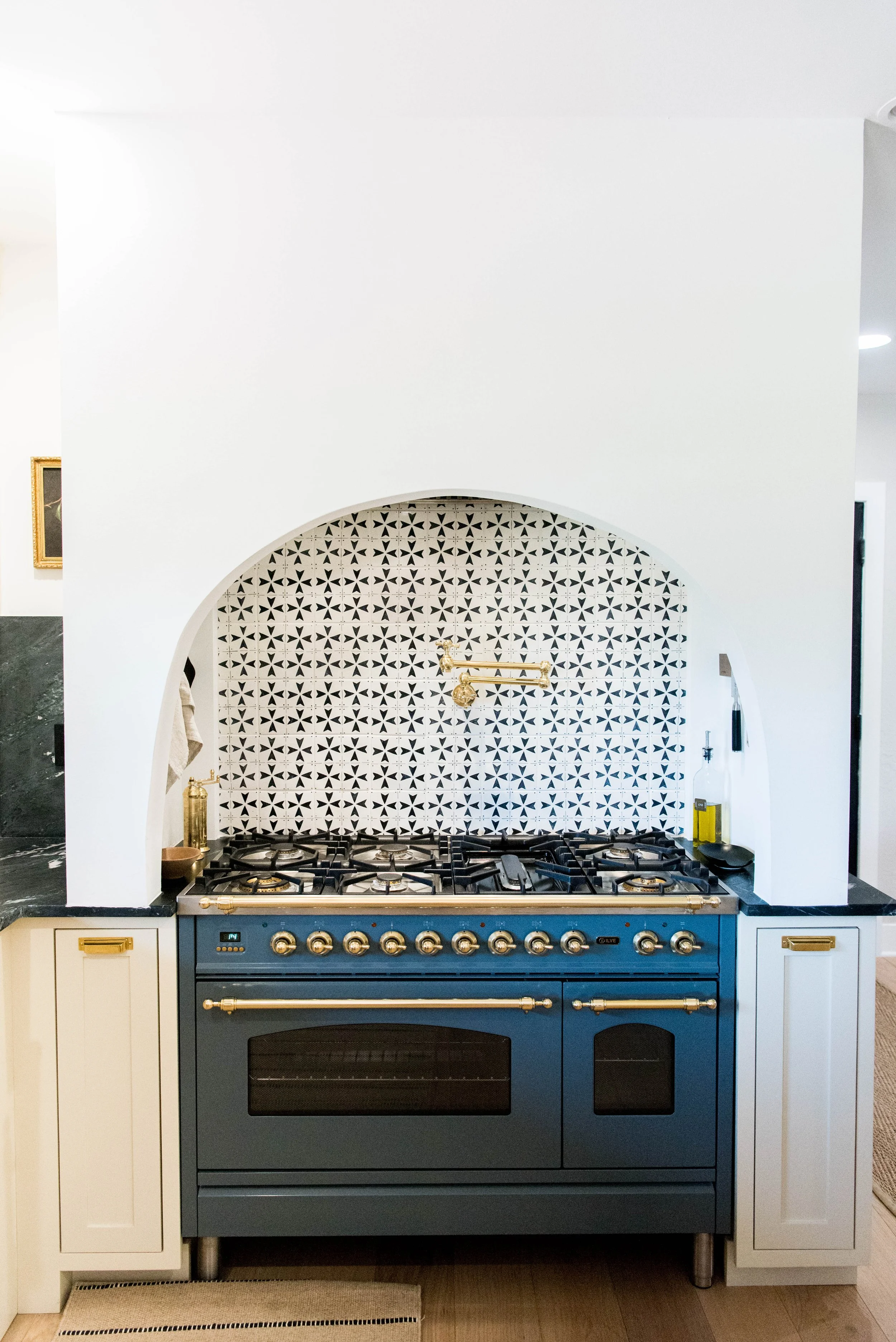 I designed this entire kitchen around this beautiful stove. I originally wanted dark cabinets and lighter Quartzite countertops. Until I came across this stove in THIS color. I then built a design that would best show off the color and style of the Ilve stove. With that, lighter cabinets were a must with a strong contrast. The black soapstone countertops with the stained wood accents tied this space together better than I could have ever imagined.